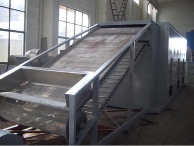 物料由加料器均匀地铺在网带上,网带采用12-60目不锈钢丝网。由传动装置拖动在干燥机内移动。干燥机由若干单元组成,每一单元热风独立循环,部分尾气由专门排湿风机排出,废气由调节阀控制,热气由下往上或由上往下穿过铺在网带上的物料,加热干燥并带走水分。网带缓慢移动,运行速度可根据物料温度自由调节,干燥后的成品连续落入收料器中。上下循环单元根据用户需要可灵活配备,单元数量可根据需要选取, 料斗中的物料由加料器均匀地铺在网带上,网带一般采用12-60目不锈钢丝网,由传动装置拖动在干燥机内移动。干燥机由若干单元组成,每一单元热风独立循环,其中部分尾气由专门排湿风机排出,每一单元排放废气量均由调节阀控制。